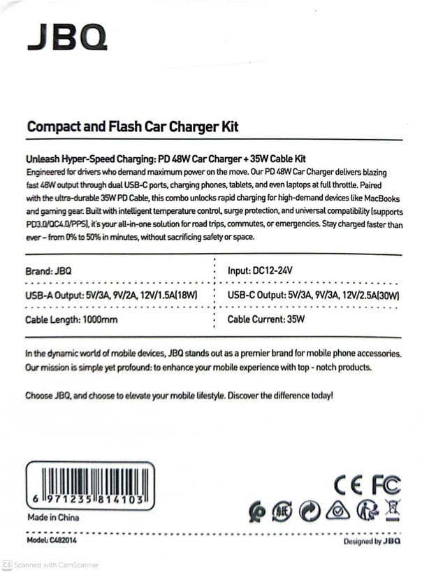 شارژر فندکی قدرتمند و پرسرعت JBQ با دو پورت مجهز به فناوری Power Delivery (PD) و Quick Charge (QC) و قدرت کلی 48 وات، همراه با کابل اختصاصی Type-C به Lightning، راهحلی ایدهآل برای شارژ سریع و مطمئن دستگاههای همراه در خودرو است.